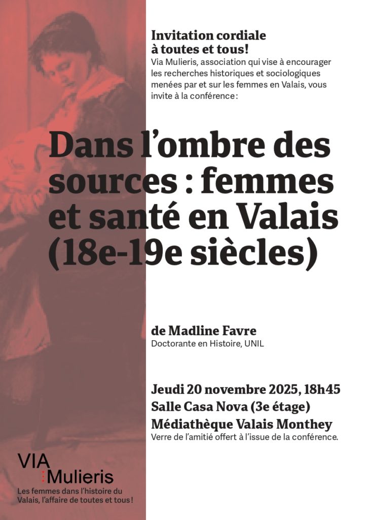 Via Mulieris est une association qui vise à encourager les recherches menées sur et par les femmes en Valais, à soutenir la diffusion de publications, la création de projets, la mise en œuvre d’événements et à favoriser les échanges avec d’autres associations poursuivant des buts similaires.