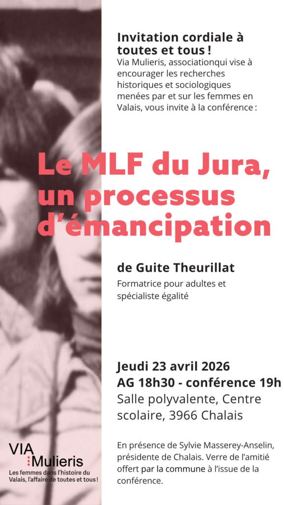 Via Mulieris est une association qui vise à encourager les recherches menées sur et par les femmes en Valais, à soutenir la diffusion de publications, la création de projets, la mise en œuvre d’événements et à favoriser les échanges avec d’autres associations poursuivant des buts similaires.